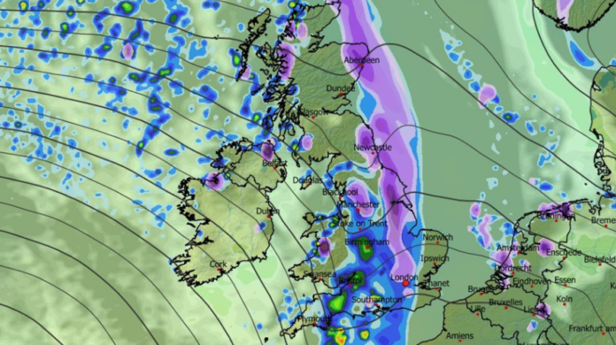 The ECMWF weather model suggests snowfall in western parts of Scotland, England, and Wales on Wednesday, with heaviest snow in Scotland at a rate of around four inches per hour initially. By midday Wednesday, snow is forecasted to reach southern parts of England, north of London, and around Gloucestershire, with potential snow in Northern Ireland.