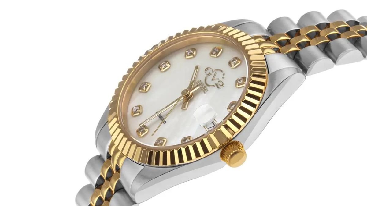 This luxury timepiece boasts a Swiss quartz movement for precise timekeeping, a two-tone gold and steel bracelet with a deployment clasp, and intricate geometric design elements inspired by the city of Naples. The watch features a mother of pearl dial encircled by 11 single cut diamonds, set in gold with a textured bezel, push-pull crown, and magnified date display. Available in rose gold, silver, or gold options, the watch is water-resistant up to 50 meters and features anti-reflective sapphire.